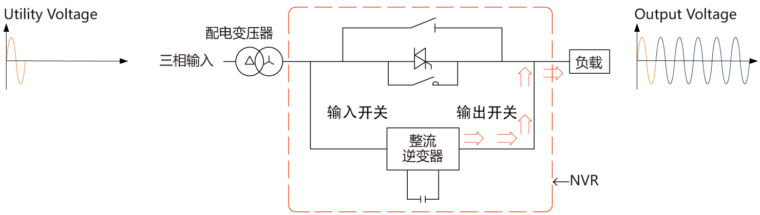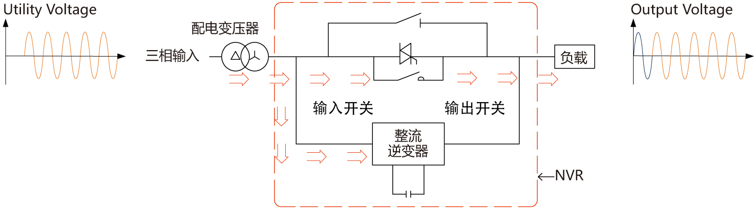 ? ?NVR故障或維護的情況下,負載電流將自動轉(zhuǎn)移到故障安全旁路。即電流將通過并聯(lián)于雙反接晶閘管的接觸器或旁路開關(guān),直接向負載供電。